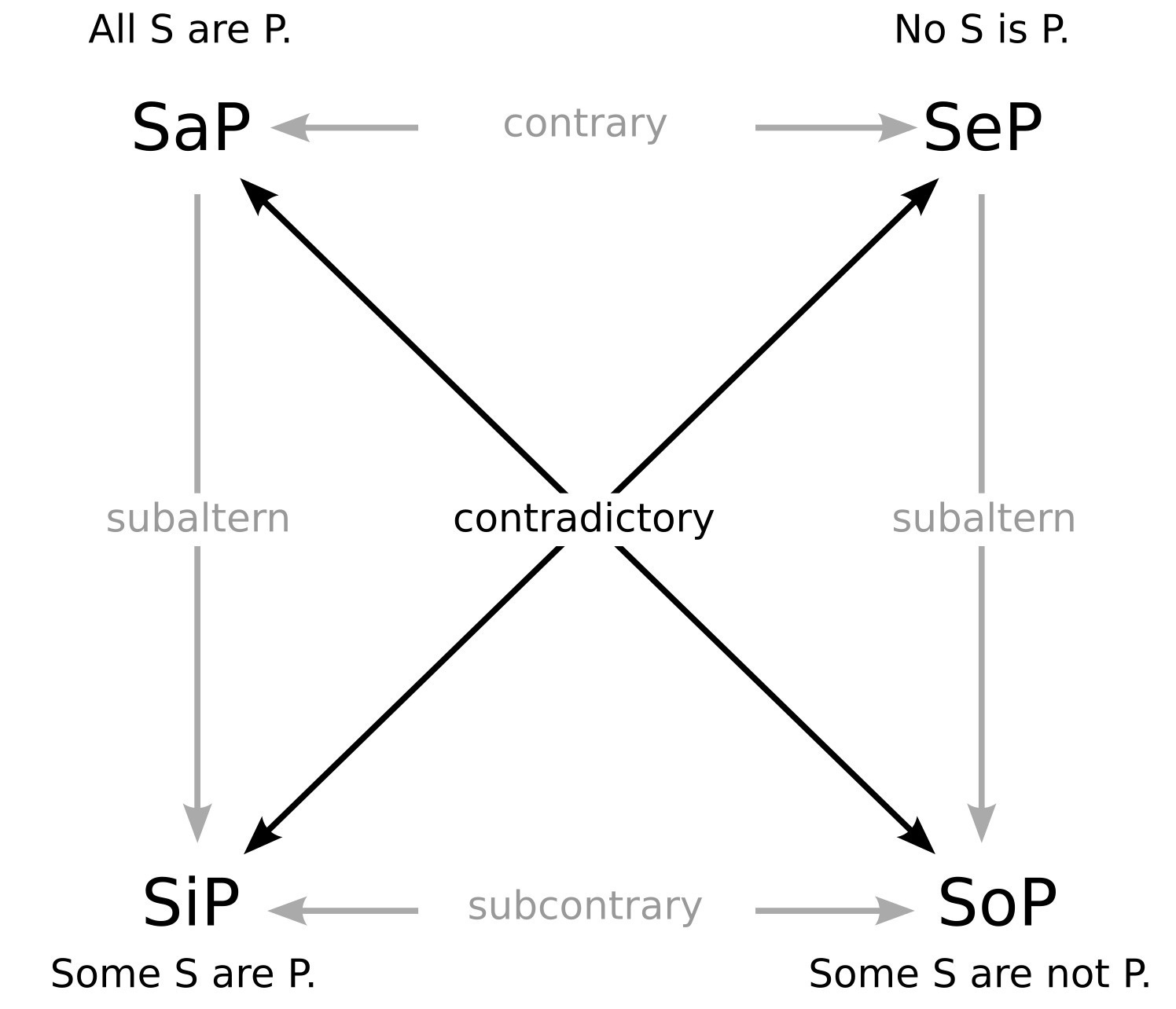 Jolivet defines opposition as “the relation between two propositions, which, having the same subject and the same predicate, have one quality or quantity that is different, or, at the same time, a quality and a quantity that are different.” (CdF) The concept of opposition is how you get the famous square of opposition shown above, where the relationship between each type of proposition is clearly delineated.